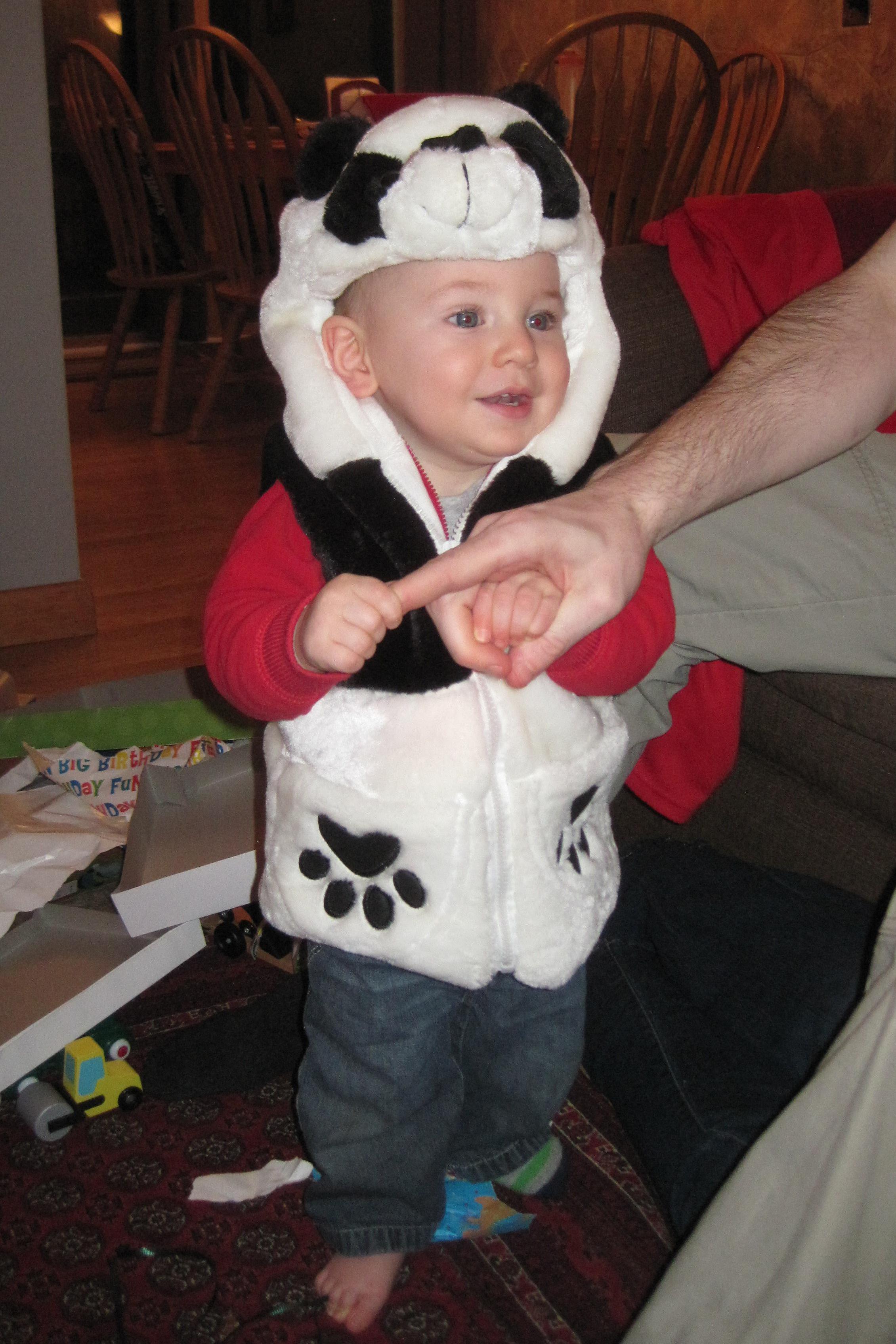 Modeling his Panda Outfit.JPG