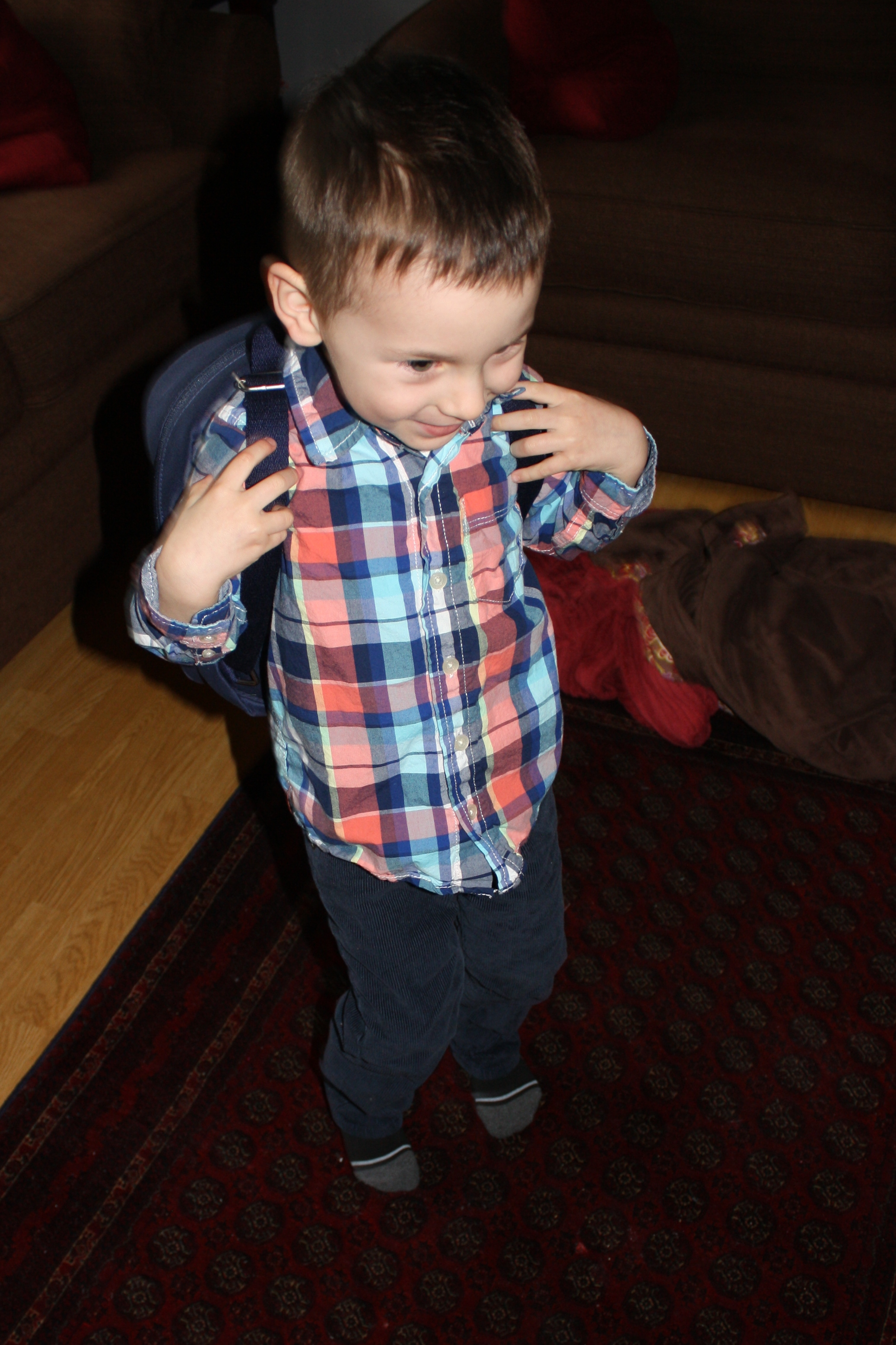 Trying on His New Backpack