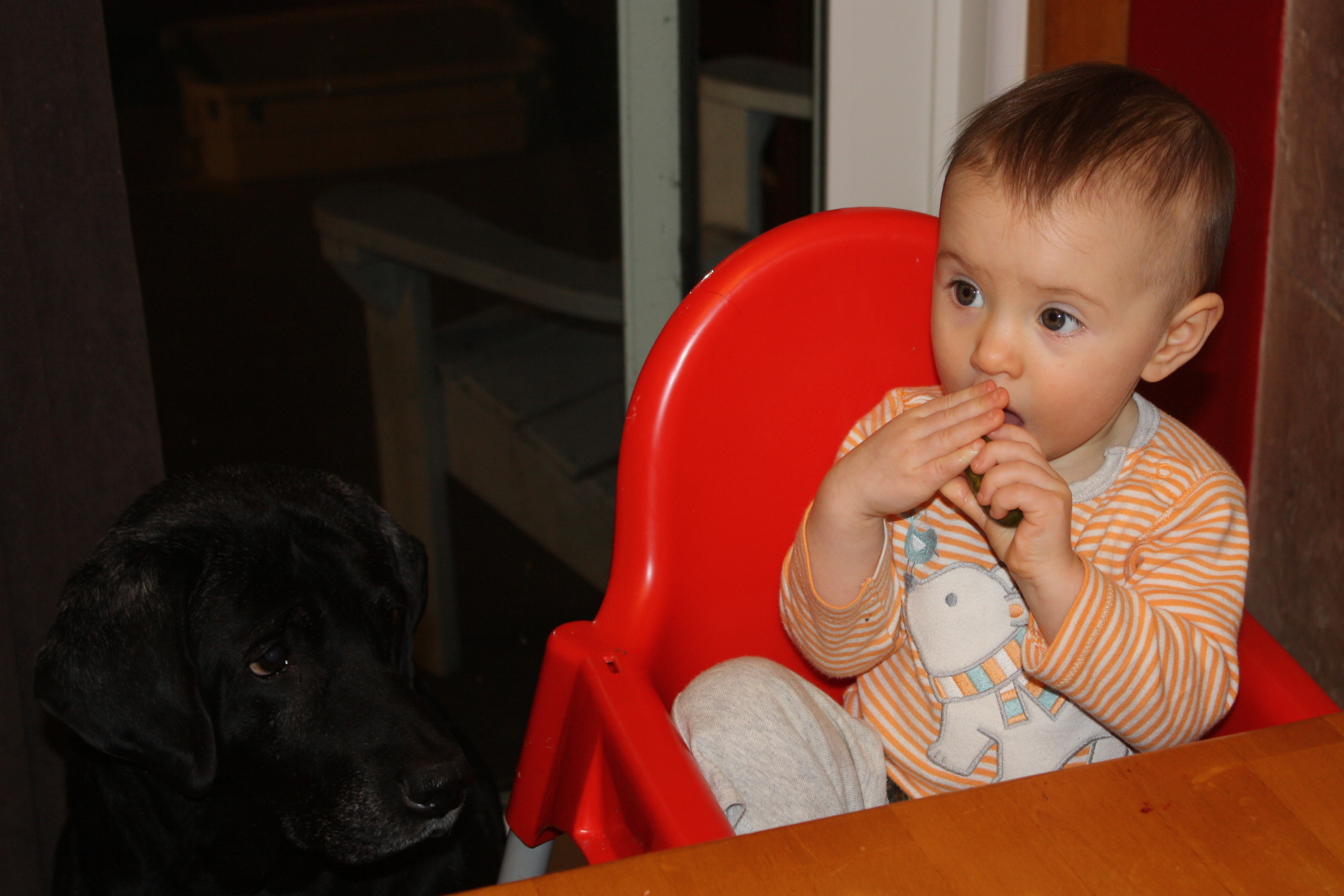 Evie Tries a Pickle With Loki Standing By.JPG