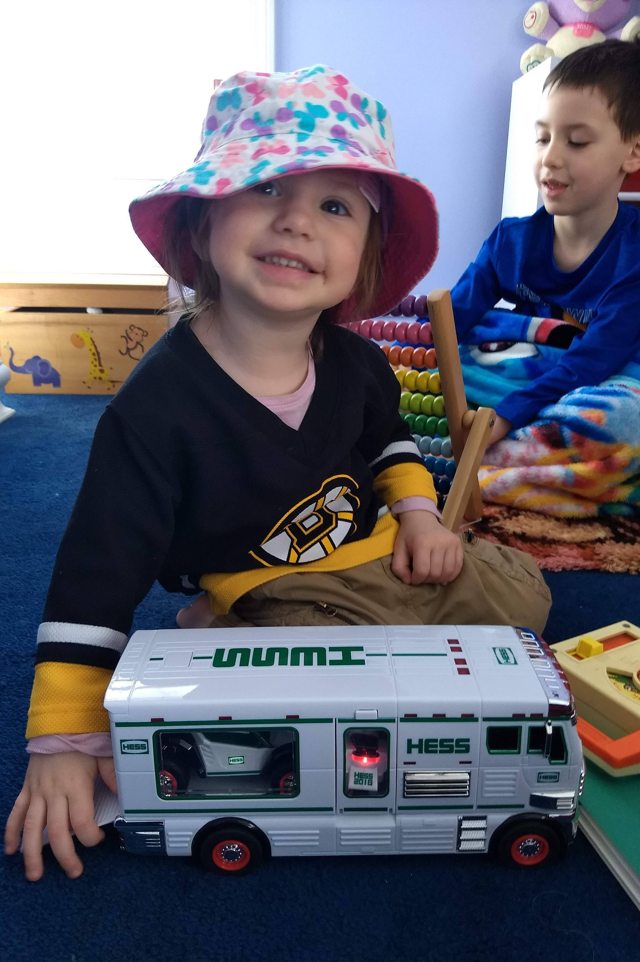 Hess Trucks and Her Beach Hat