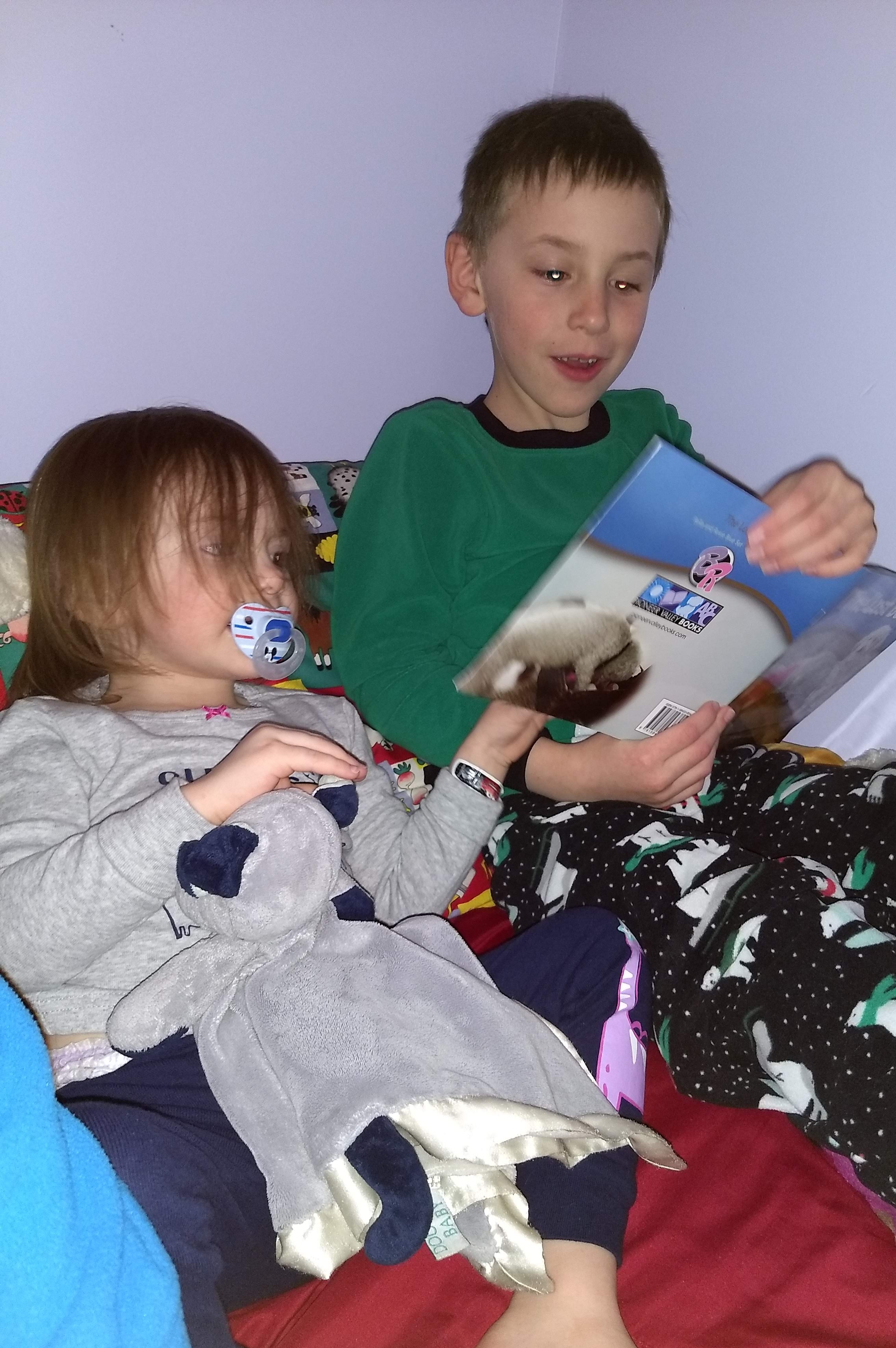 Reading Rosie and Bellla to His Sister.jpg