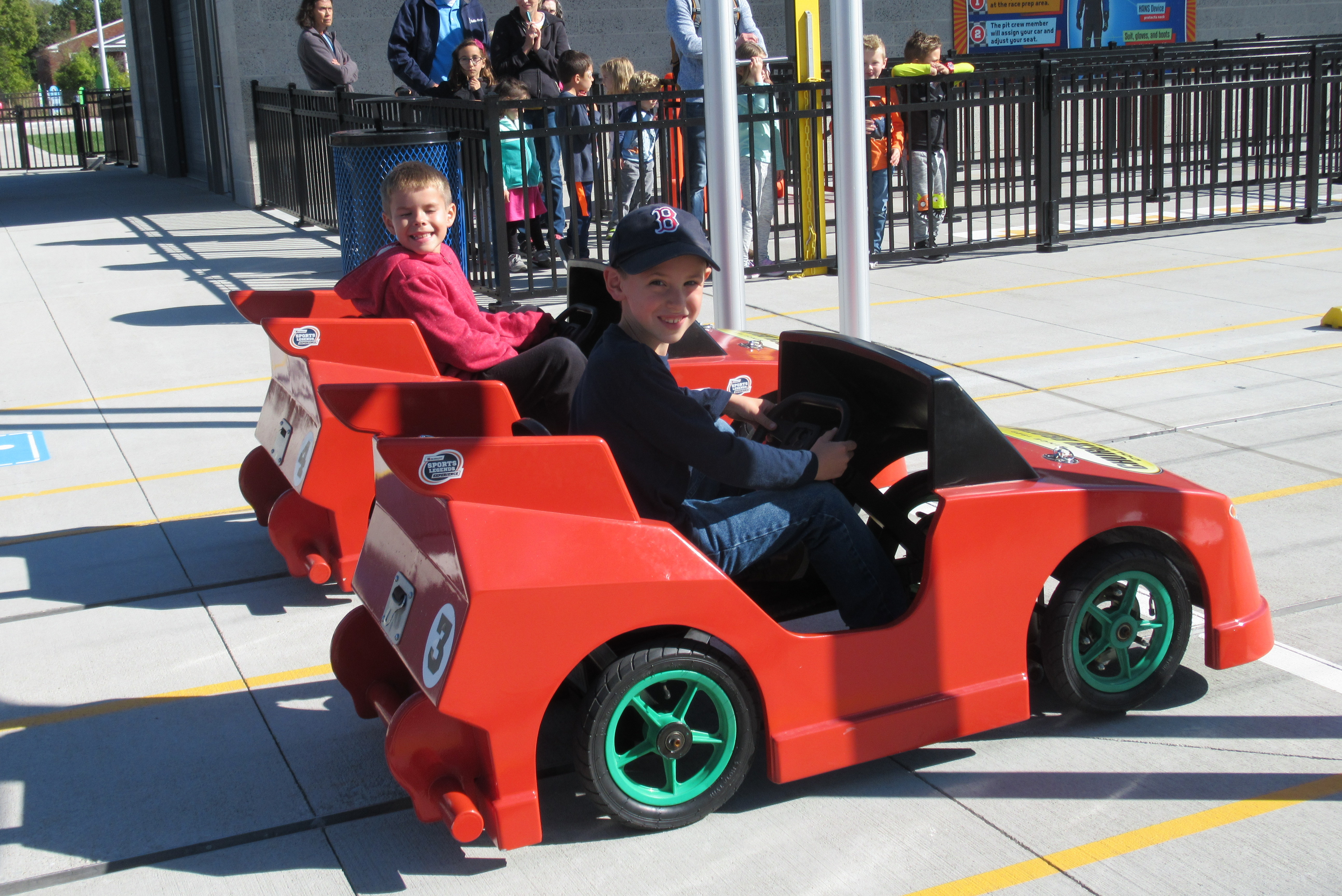 Thomas and Cooper in the Red Cars.JPG