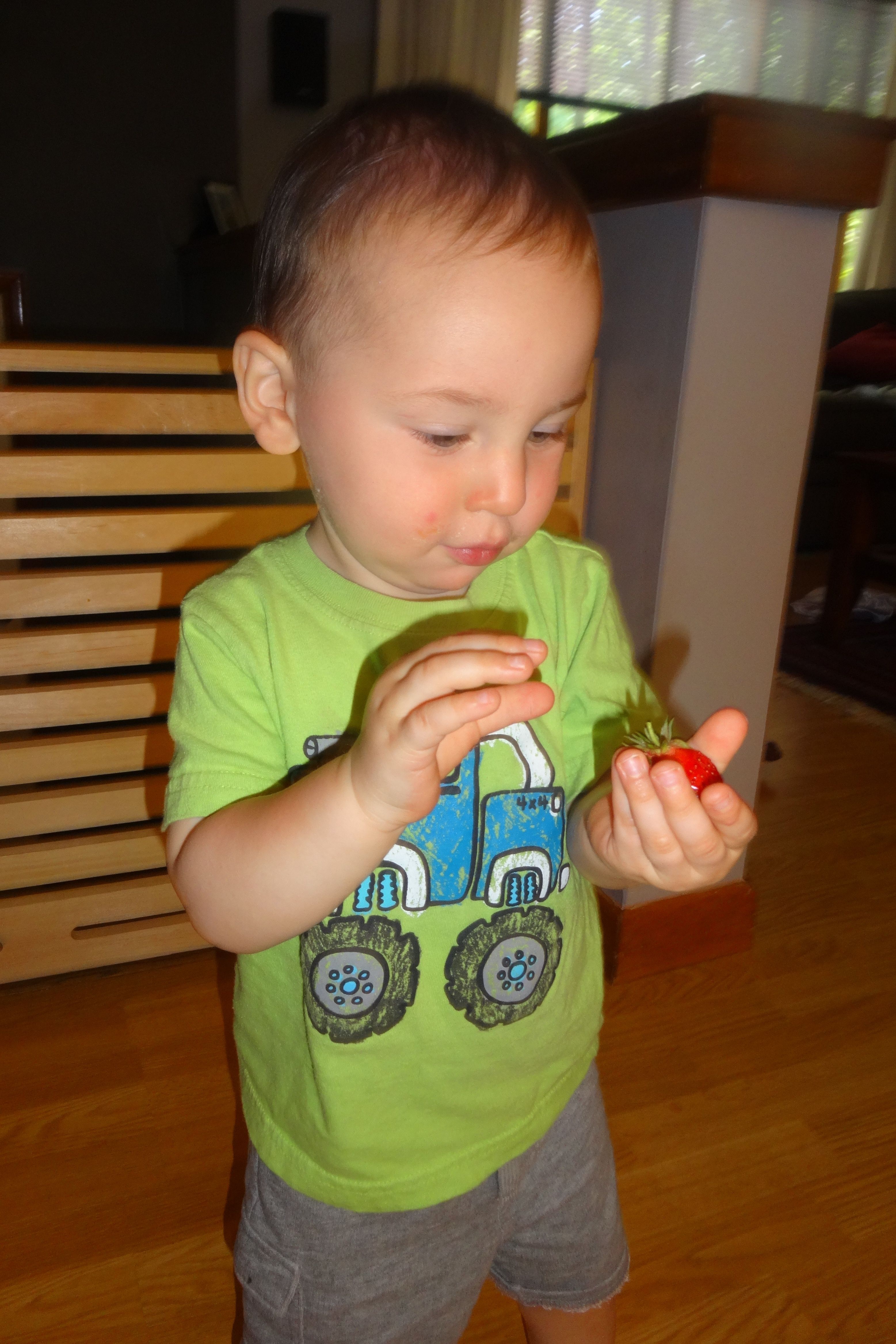 Inspecting Our First Garden Strawberry.JPG