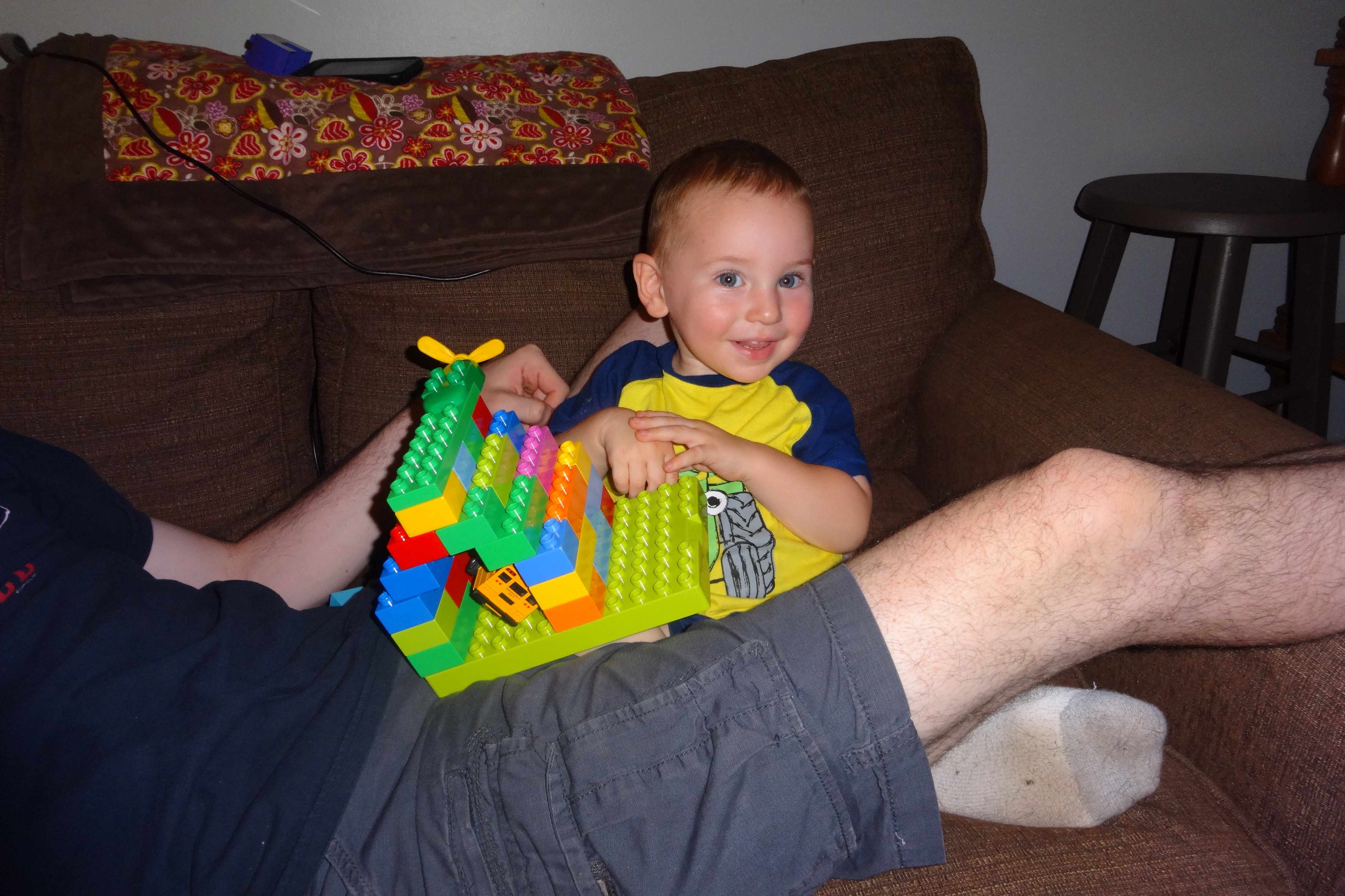 Duplo Garage on Daddys Lap.JPG
